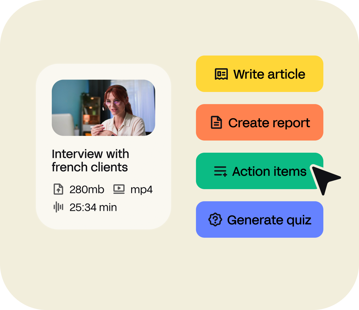 Transform your meetings into anything you need with our AI assistant, AskAI. Create articles, reports, quizzes, action items and much more with the help of AI Notetaker.