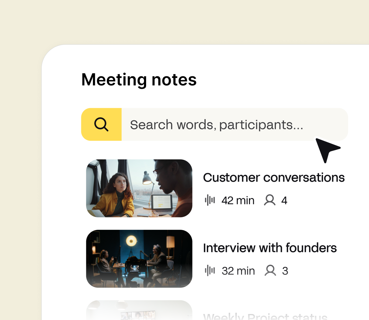 Our AI Notetaker joins your virtual meetings as a silent participant. No need to click anything — it starts recording, transcribing, and taking smart notes automatically.