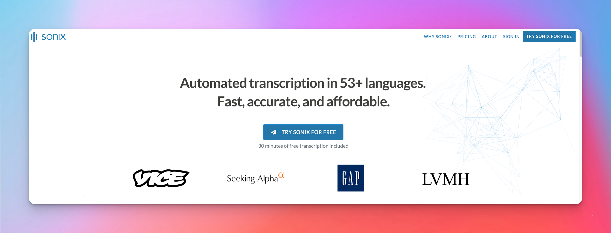 Note: Sonix offers 30 free minutes with no credit card required; users should confirm the exact pricing model at checkout.