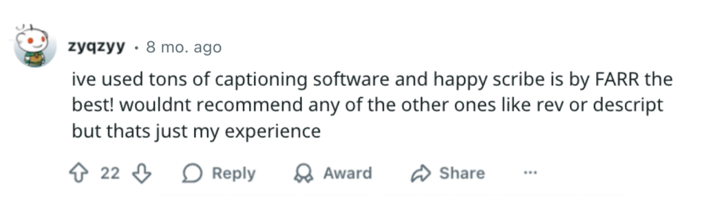 On Reddit, one user says "ive used tons of captioning software and happy scribe is by FARR the best! wouldnt recommend any of the other ones like rev or descript but thats just my experience".
