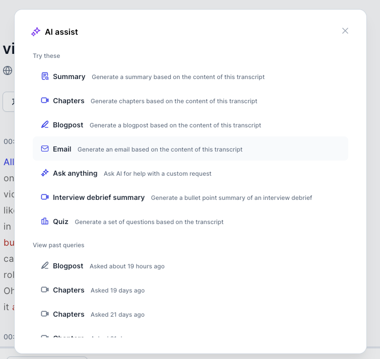 The Make With AI feature proves indispensable when creating emails from transcripts. Whether it's a recorded meeting, an interview, or a brainstorming session, HappyScribe can transcribe and format your thoughts into an articulate, ready-to-send email.