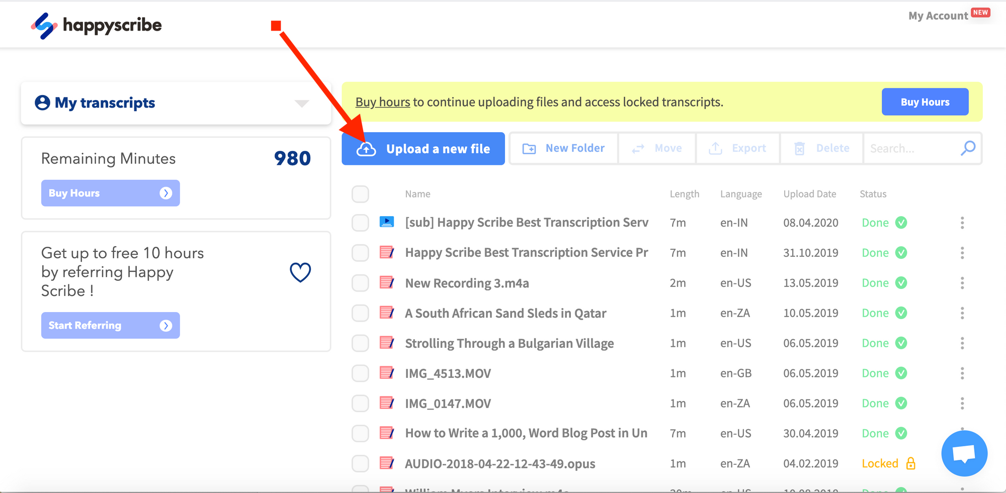 Once you have successfully signed up, you can upload your recording to HappyScribe.
