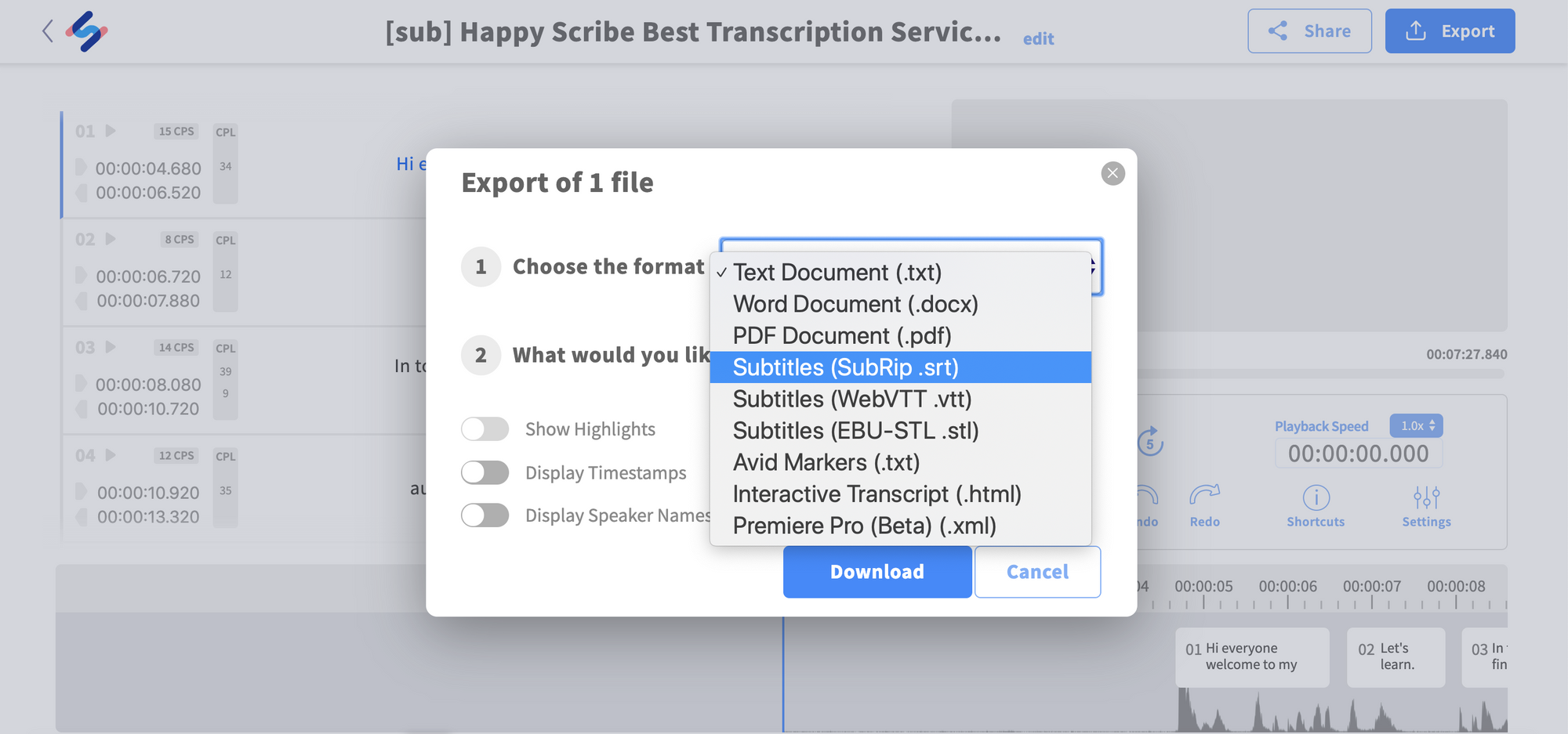 Your transcript is done! Click Export and export as Subtitles (SubRip .srt) file.