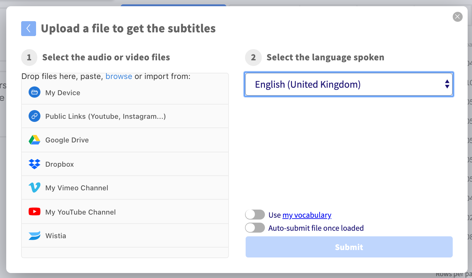 Log in to your HappyScribe account and click on 'Upload a New File'. When it asks you 'What do you need?' select subtitles. Next, simply select your video file from your device or import from your favourite cloud-based file storage like Google Drive or Dropbox. Alternatively, import your video directly from YouTube, Wistia or Vimeo. There is no file size restriction.