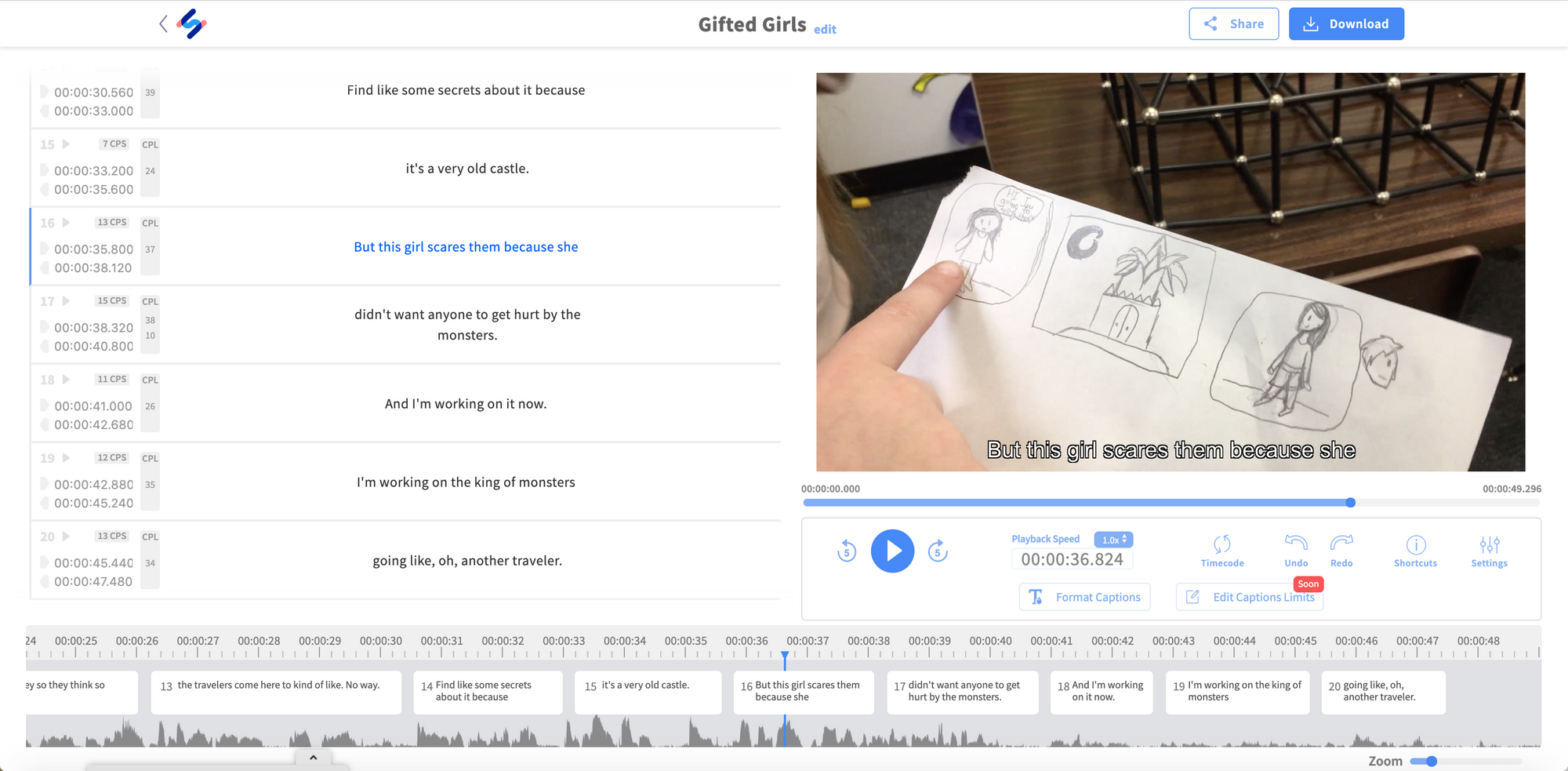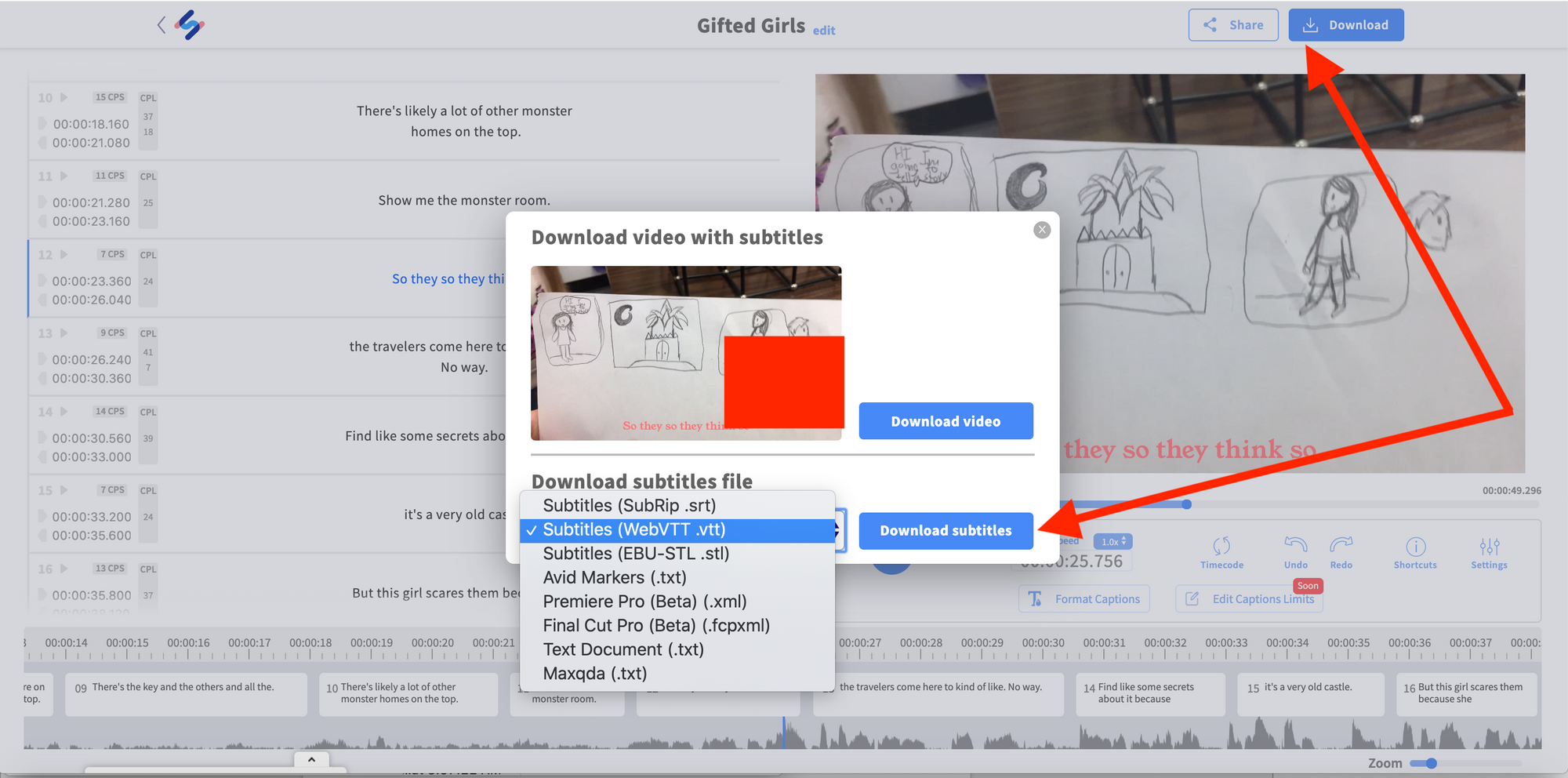 That's it! HappyScribe's Subtitle Generator has correctly generated your WebVTT subtitles and synched the text with your video. All you have left to do is download your video! In order to do that, just click on top-right corner button "Download". By clicking on "Download video", you will be able to download your video in WebVTT format.