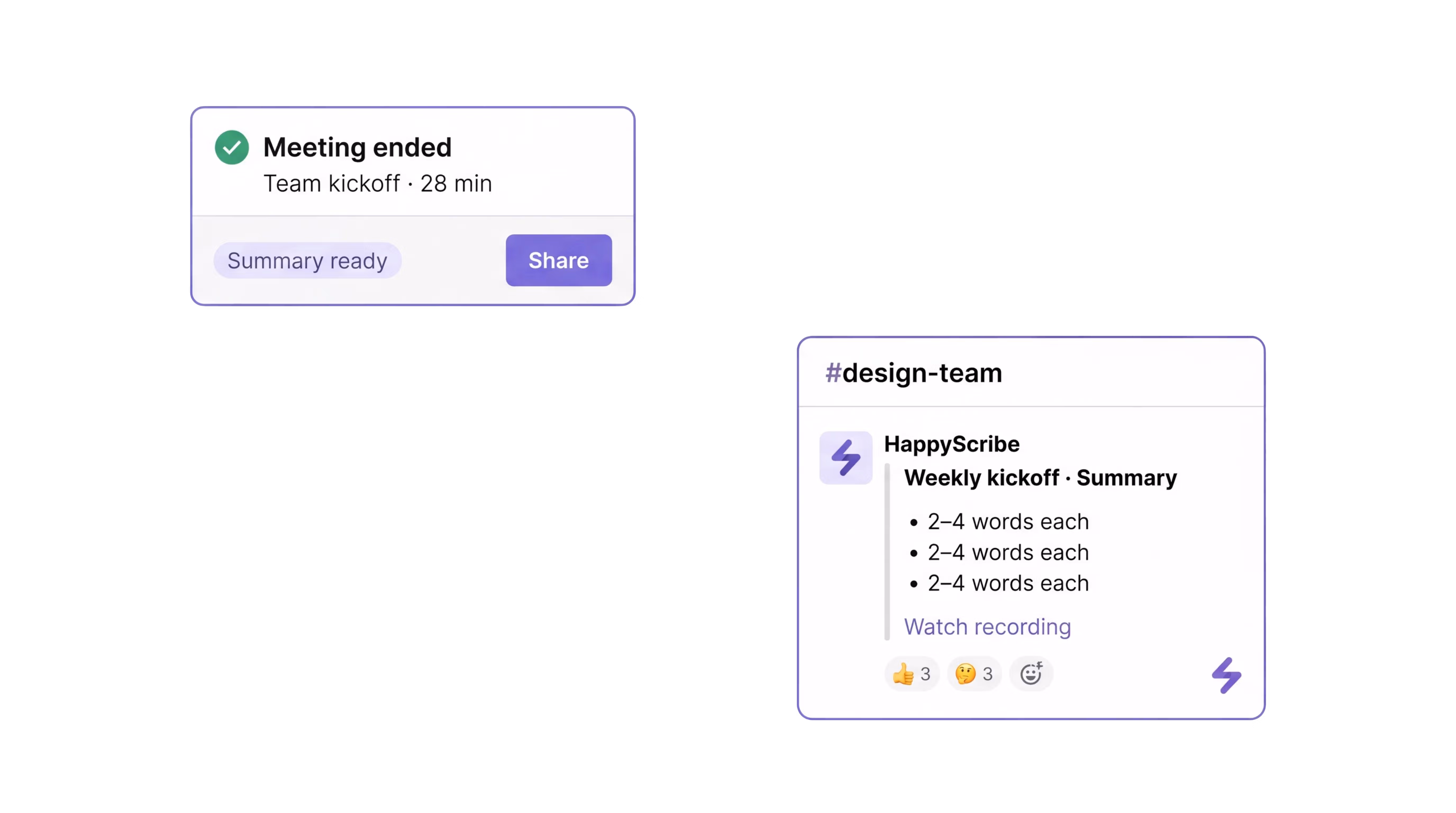 HappyScribe joins your Zoom, Teams, or Google Meet and produces a transcript, an AI summary, and a list of decisions and owners. Teammates who could not attend read the summary, scan the decisions, and jump to specific timestamps in the transcript. The live meeting becomes a one-time event. The artifact is what the rest of the team actually uses.