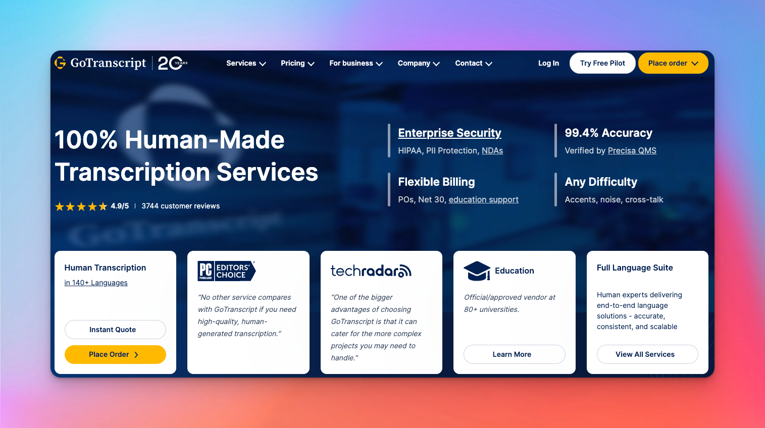 Thanks to a strong privacy framework and flexible API access, GoTranscript has become a reliable partner for regulated industries.
