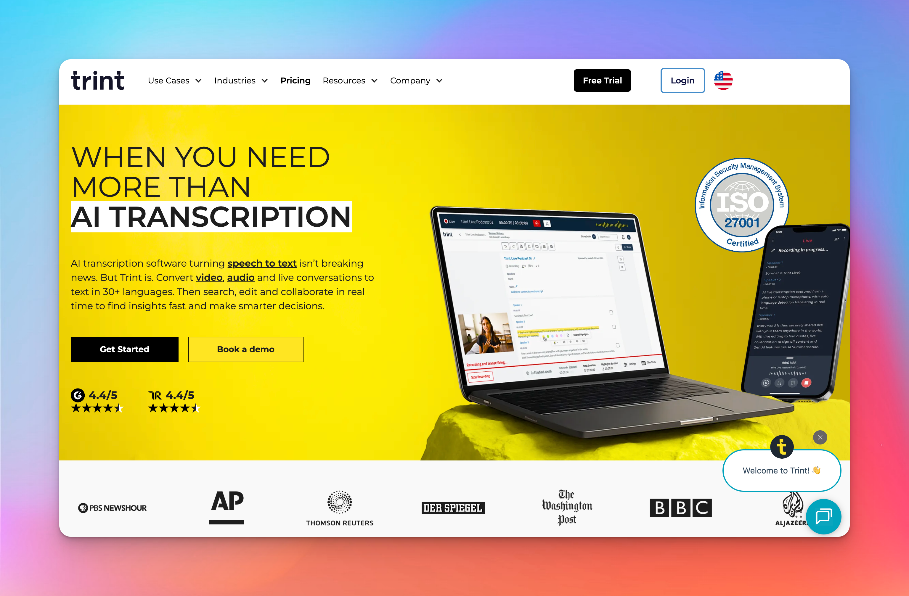 | Trint | Newsrooms, research teams, multilingual collaboration | $80/seat/mo | 40+ transcription, 70+ translation | Live transcription from any source + AI Assistant |