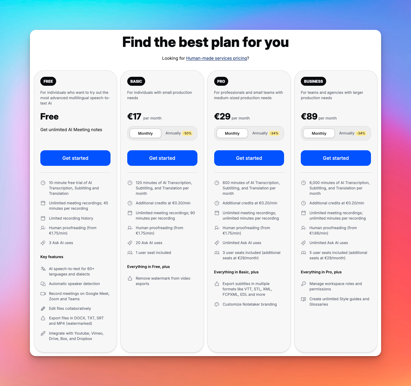 - Human transcription: Starts from $1.08/min for English