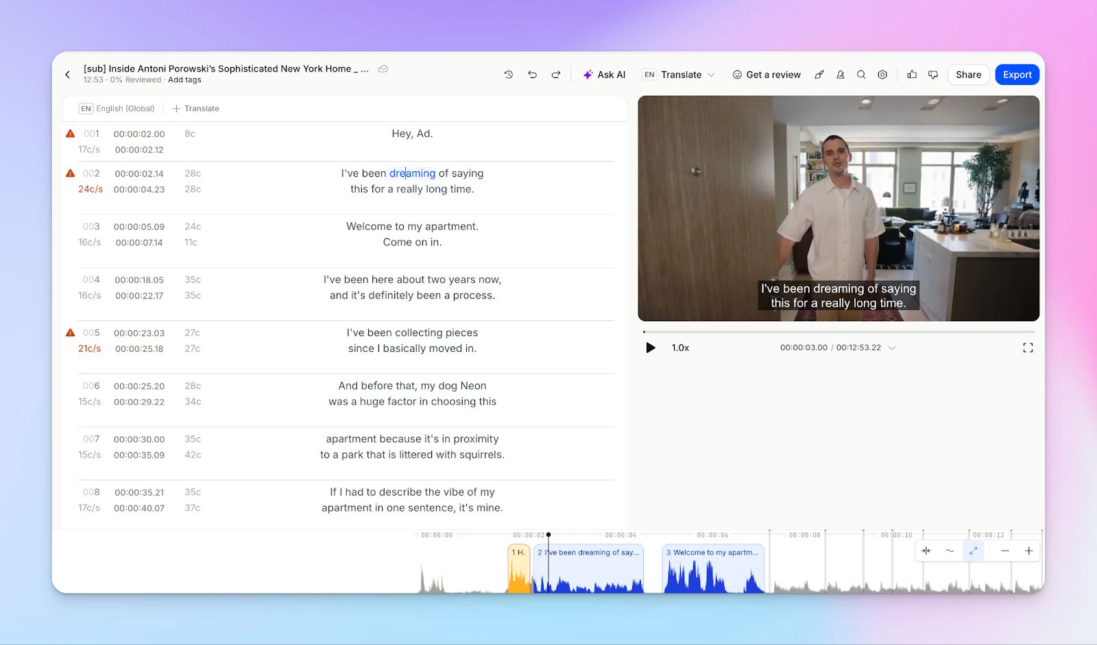 With HappyScribe, I can start with a messy recording and end with something that is genuinely ready to ship: a cleaned-up transcript, subtitles that meet professional standards, or a translated version for another market.