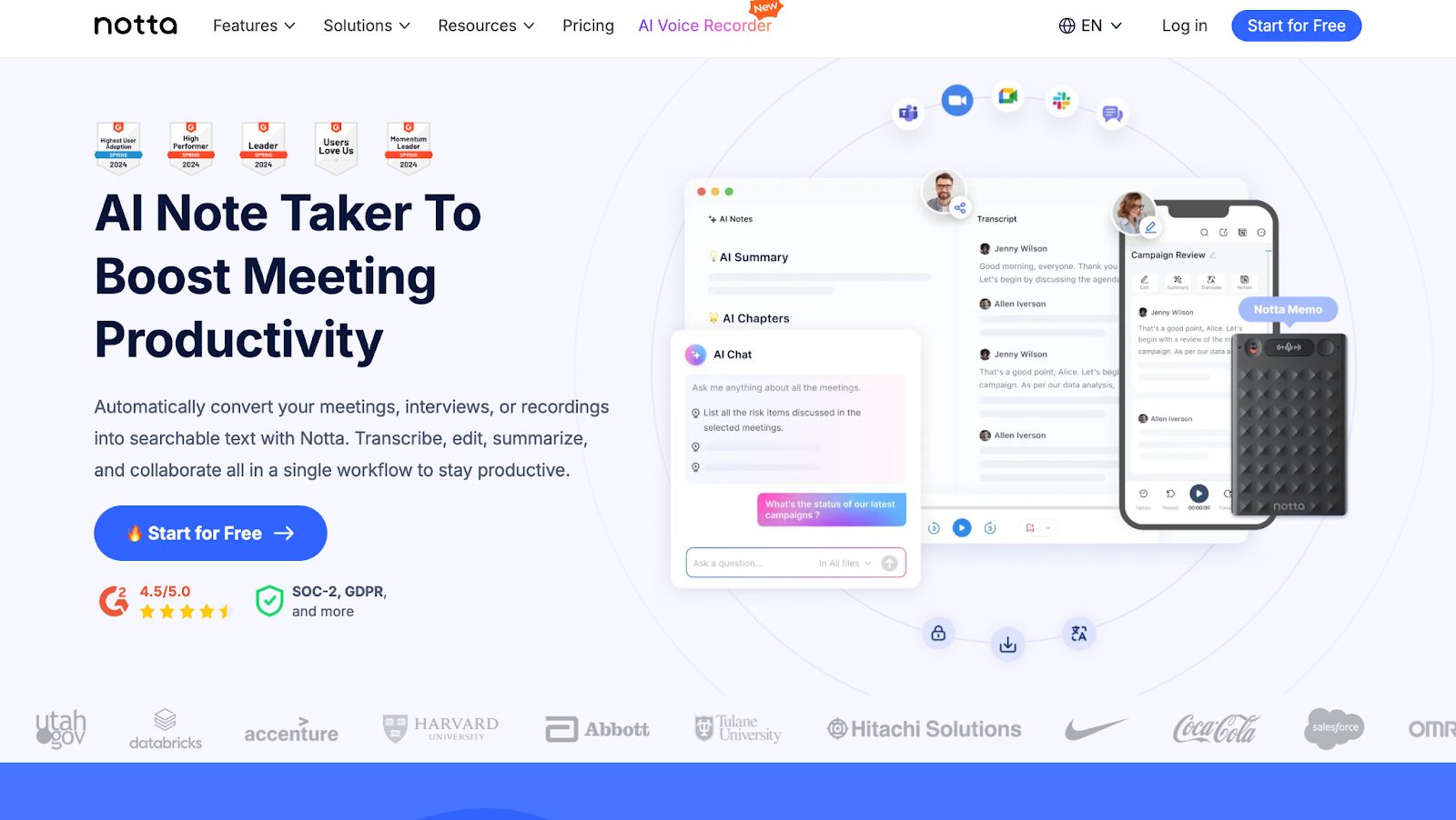 - Real-Time Transcription & Sync: Transcribes live meetings (Zoom, Teams, Google Meet) and syncs recordings across devices.
