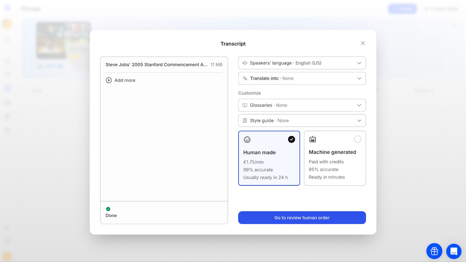 For use cases where accuracy cannot be compromised, HappyScribe offers a human transcription service with 99% accuracy.